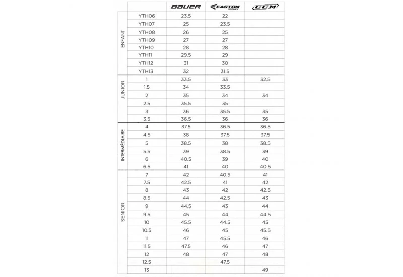 | Pointure bauer | Intermédiaire 4 (Taille 37.5), Intermédiaire 4.5 (Taille 38.5), Intermédiaire 5 (Taille 38.5), Intermédiaire 5.5 (Taille 39), Intermédiaire 6 (Taille 40.5), Intermédiaire 6.5 (Taille 41), Senior 7 (Taille 42), Senior 7.5 (Taille 42.5), Senior 8 (Taille 43), Senior 8.5 (Taille 44), Senior 9 (Taille 44.5), Senior 9.5 (Taille 45), Senior 10 (Taille 45.5), Senior 10.5 (Taille 46), Senior 11 (Taille 47), Senior 11.5 (Taille 47.5), Senior 12 (Taille 48) |